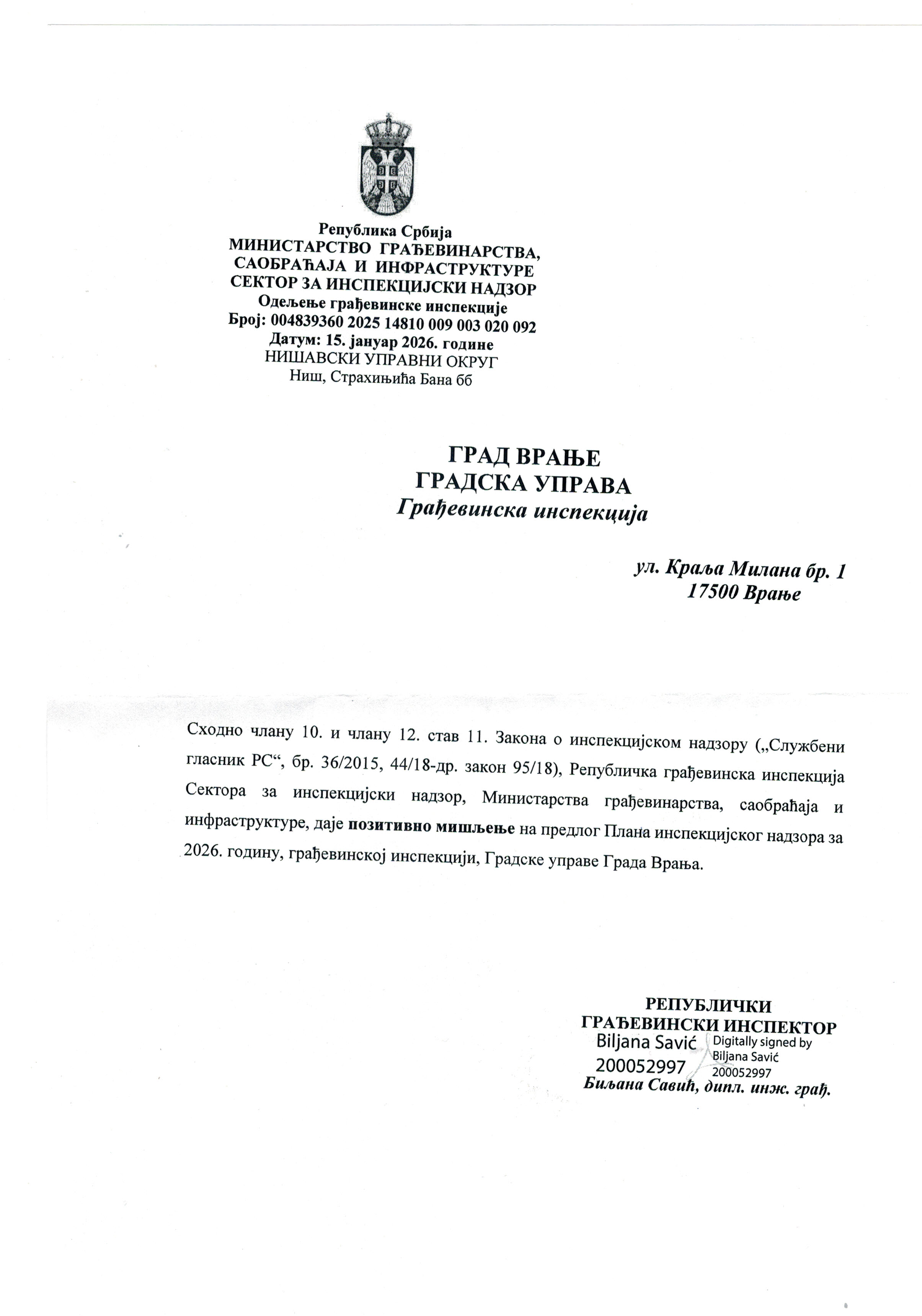 Позитивно мишљење Министарства грађевинасртва, саобраћаја и инфарструктуре на Предлог плана инспекцисјког надзора, грађевинској инспекцији за 2026.годину