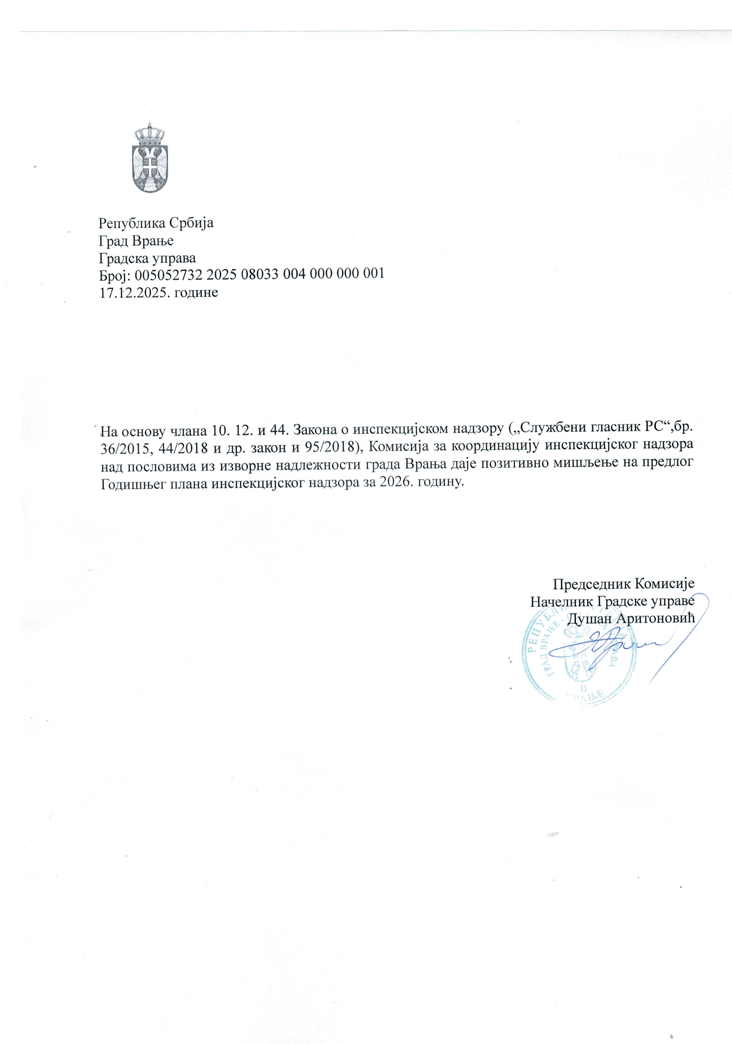 Позитивно мишљење координационе комисије на предлог Годишњег Плана инспекцијскох надзора за 2026.годину