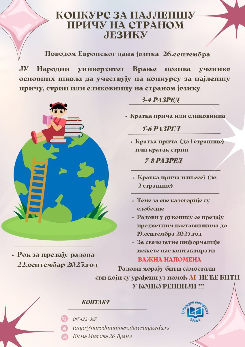 Javna ustanova Narodni univerzitet Vranje, u saradnji sa osnovnim i srednjim školama grada i ove godine obeležava 26. septembar – Dan evropskih jezika. Program se sastoji iz dva segmenta: konkurs za najlepšu priču na stranom jeziku i završna svečanost - ,,Pesma Evrovizije“. Konkurs za najlepšu priču na stranom jeziku biće organizovan u tri uzrasne kategorije: