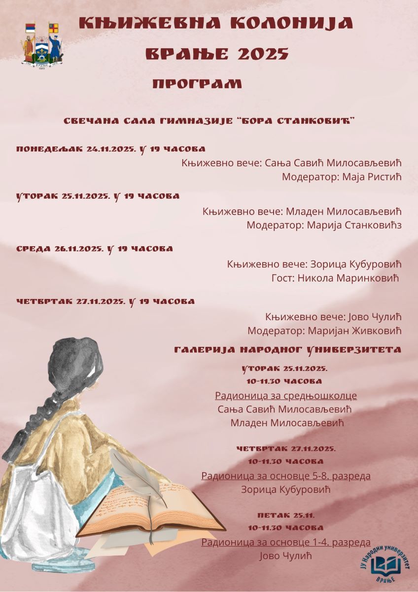 Od 24. do 28. novembra u Vranju će biti održana ,,Književna kolonija 2025”, u organizaciji Narodnog univerziteta. Otvaranje kolonije najavljeno je za ponedeljak 24. novembra od 19 sati, u svečanoj sali Gimnazije Bora Stanković. Za prvo veče najavljena je promocija knjige ,,Martin udio“, autorke Sanje Savić Milosavljević, dok će se narednog dana održati književno veče Mladena Milosavljevića. U sredu 26. novembra biće predstavljena knjiga ,,Pre sna – bajke za velike i male“, autorke Zorice Kuburović. Uz autorku, gost večeri biće Nikola Marinković, glavni i odgovorni urednik Srpske književne zadruge. Poslednje večeri kolonije, u četvrtak 27. novembra, biće predstavljena knjiga ,,O drugovima i vukovima“, autora Jove Čulića. U sklopu ,,Književne kolonije“, od utorka do petka, u Galeriji Narodnog univerziteta biće organizovane tri radionice, sa početkom u 10 časova.
