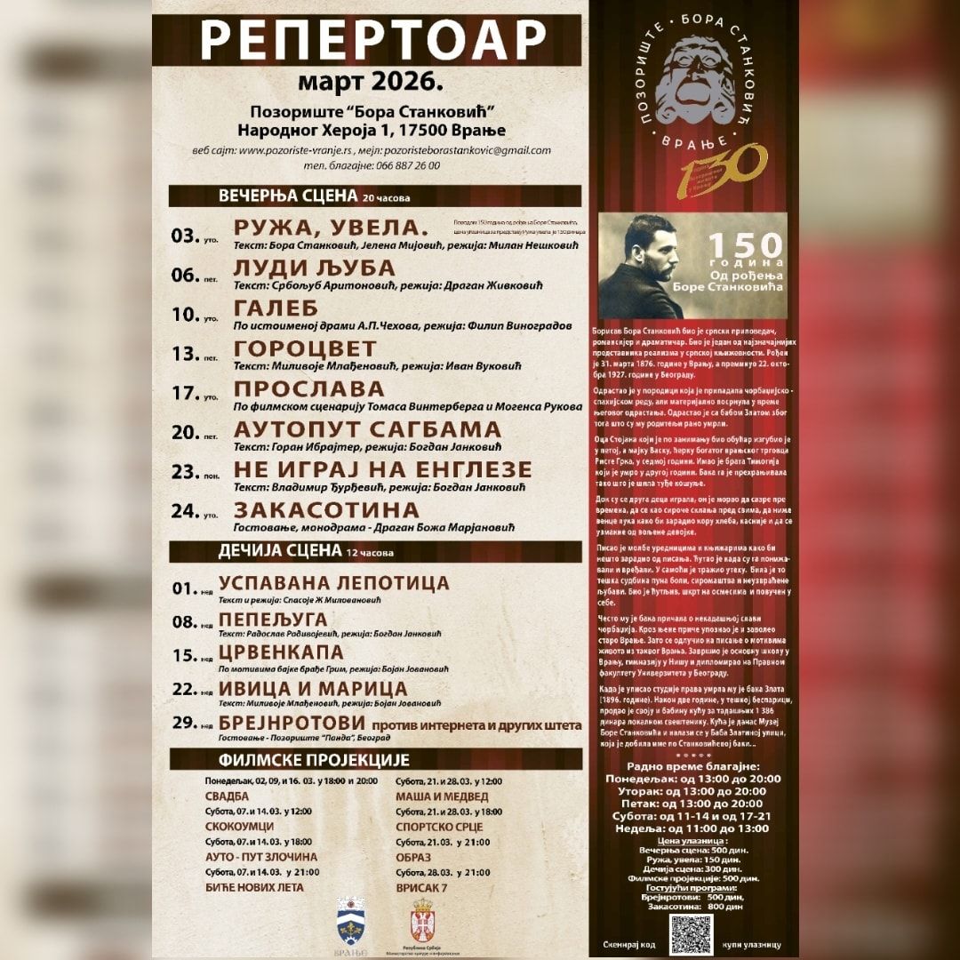 U petak, 20. marta od 20 časova u pozorištu će biti prikazana predstava ,,Autoput Sagbama“, po tekstu Gorana Ibrajtera i u režiji Bogdana Jankovića, dok će u ponedeljak, 23. marta u istom terminu publika moći da pogleda predstavu ,,Ne igraj na Engleze“, po tekstu Vladimira Đurđevića i u režiji Bogdana Jankovića. Na dečjoj sceni u nedelju, 22. marta, od 12 časova je predstava ,,Ivica i Marica“.