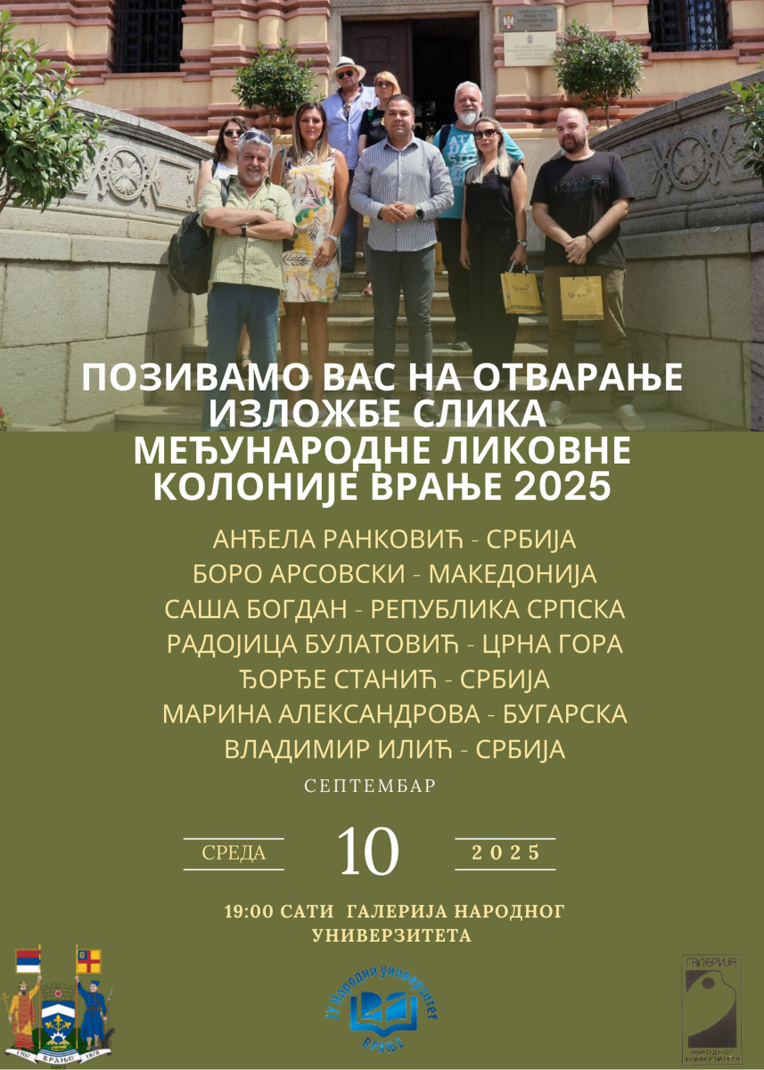 U Galeriji Narodnog univerziteta, u sredu 10. septembra, biće otvorena izložba slika učesnika Međunarodne likovne kolonije ,,Vranje 2025“. Svoje radove predstaviće Anđela Ranković, Boro Arsovski, Saša Bogdan, Radojica Bulatović, Đorđe Stanić, Marina Aleksandrova i Vladimir Ilić. Otvaranje izložbe zakazano je za 19 časova.