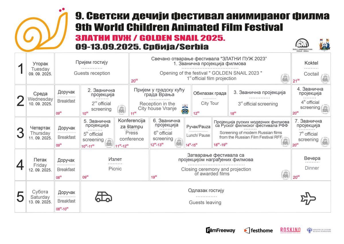 Svetski dečji festival animiranog filma ,,Zlatni puž 2025", počinje sutra i trajaće do 13. septembra. Glavni program ovogodišnje manifestacije zasniva se na projekcijama prijavljenih filmova koji su prošli selekciju, ocenjivanju od strane stručnog žirija i publike i dodeli nagrada najboljima. Podrška glavnom programu biće sastanak članova ASIF-e u Vranju, prikazivanje ruskog animiranog filma, obilazak grada i upoznavanje gostiju festivala sa našim kulturnim nasleđem, tradicionalni ŠAF-ov izlet, kao i izrada dokumentarnog filma. Po planu za ovu godinu, članovi žirija biće priznati poznavaoci dečjeg stvaralaštva: Žang Či iz Kine, Dejan Dabić iz Srbije i Hrvoje Selec iz Hrvatske. Organizator festivala je Javna ustanova Škola animiranog filma, uz podršku Grada Vranja i Ministarstva kulture i informisanja Republike Srbije.