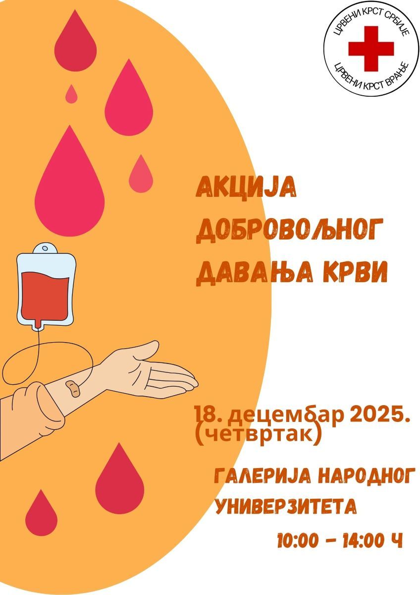 Crveni krst Vranje organizuje akciju dobrovoljnog davanja krvi u četvrtak 18. decembra od 10 do 14 časova u Galeriji Narodnog univerziteta u Vranju.