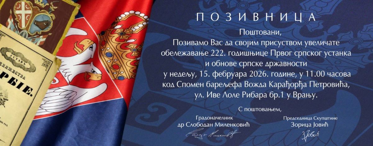 U nedelju 15. februara, kod Spomen bareljefa Voždu Karađorđu Petroviću, biće održan skup povodom obeležavanja Dana državnosti i 222. godišnjice Prvog srpskog ustanka. Prisutnima će se obratiti predsednica Skupštine Zorica Jović. Skup počinje u 11 sati.