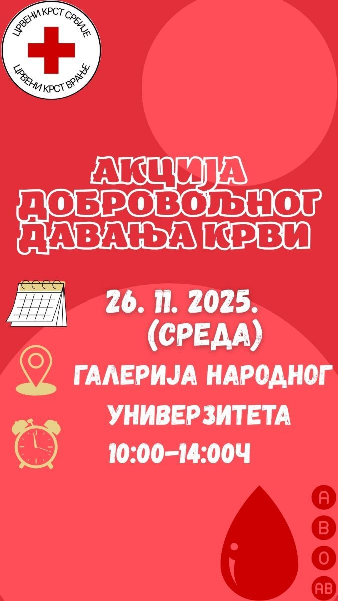 Crveni krst Vranje organizuje akciju dobrovoljnog davanja krvi u sredu 26. novembra od 10 do 14 časova u Galeriji Narodnog univerziteta u Vranju.