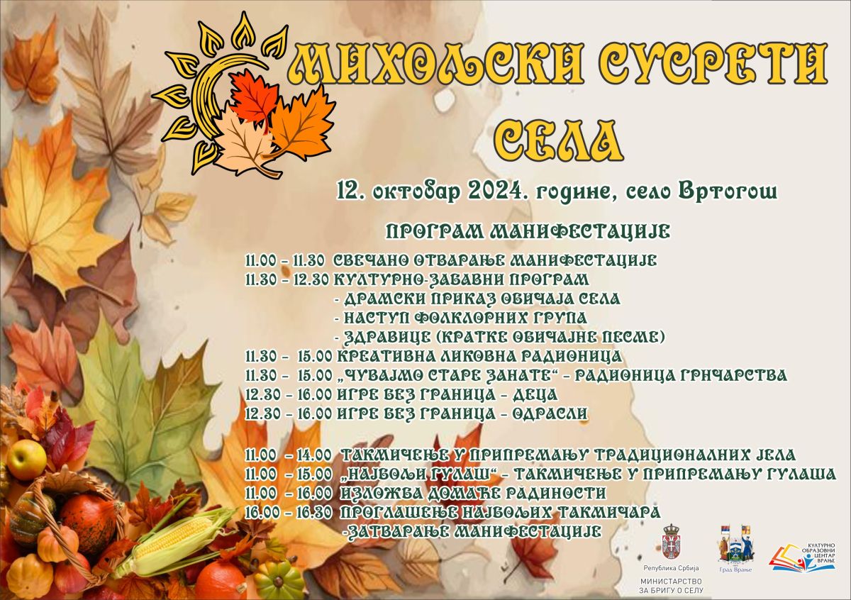 Одбор за организовање овогодишњих ,,Михољских сусрета села'' усвојио је програм  манифестације, која ће бити одржана у суботу, 12. октобра, у периоду од 11 до 16.30 сати у селу Вртогош, у порти Храма Рођења Пресвете Богородице. Програм обухвата културно-уметнички и спортско-рекреативни садржај. Планиран је драмски приказ ,,Обичаји села“, наступ фолклорних група, здравице, ликовне радионице, радионица грнчарства ,,Чувајмо старе занате“ и ,,Игре без граница“, у којима ће учествовати деца и одрасли. Такође, најављено је такмичење у припремању традиционалних јела, такмичење у припремању гулаша ,,Најбољи гулаш“, као и ,,Изложба домаће радиности". Манифестациjа се завршава у 16.30 сати, када ће бити проглашени наjуспешниjи учесници. Покровитељи манифестациjе су Министарство за бригу о селу и Град Врање, а организатор Културно – образовни центар  Врање.
