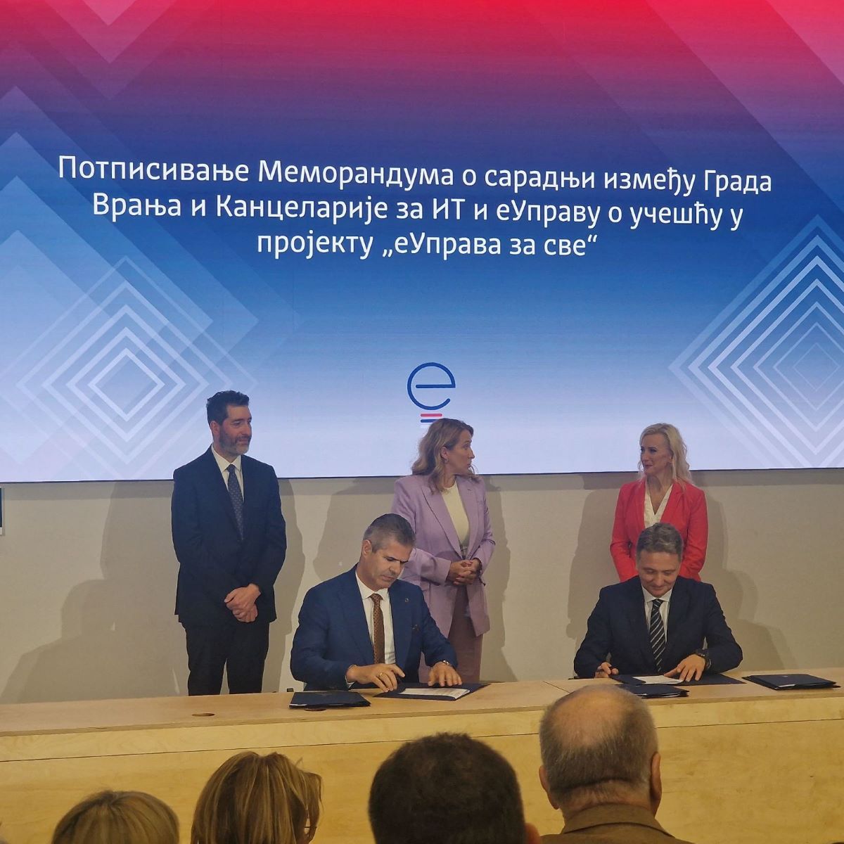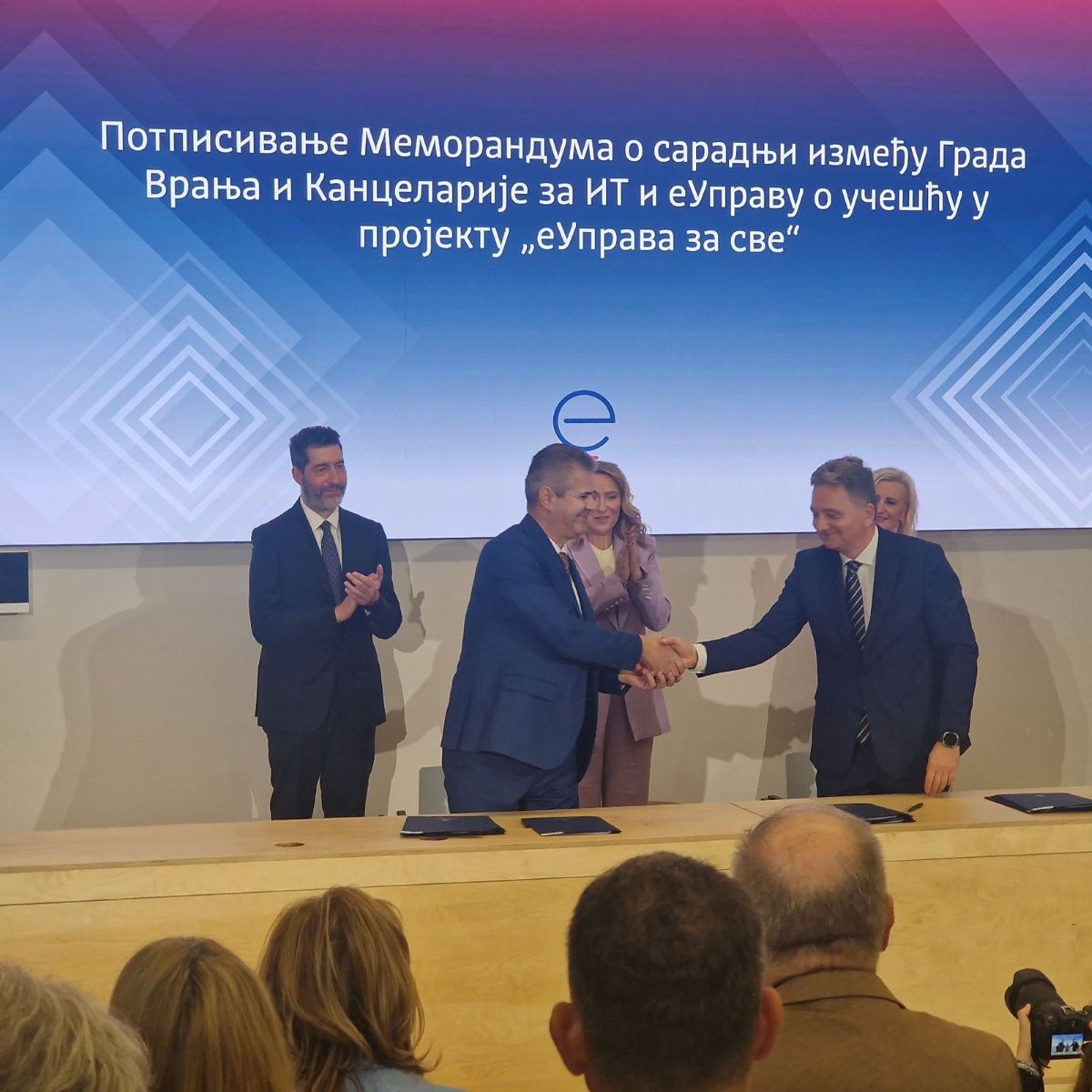 У Кући еУправе у Београду данас је покренут пројекат „еУправа за све“ и потписан Меморандум о сарадњи између Канцеларије за информационе технологије и електронску управу и градова и општина, изабраних на основу резултата и критеријума пројекта. Основни циљ је пружање стручне подршке у дигиталној трансформацији и унапређењу електронских услуга. Град Врање је једна од десет јединица локалне самоуправе изабраних по пројекту, на основу освојених бодова. Меморандум је по, овлашћењу градоначелника, потписао начелник Градске управе Душан Аритоновић.