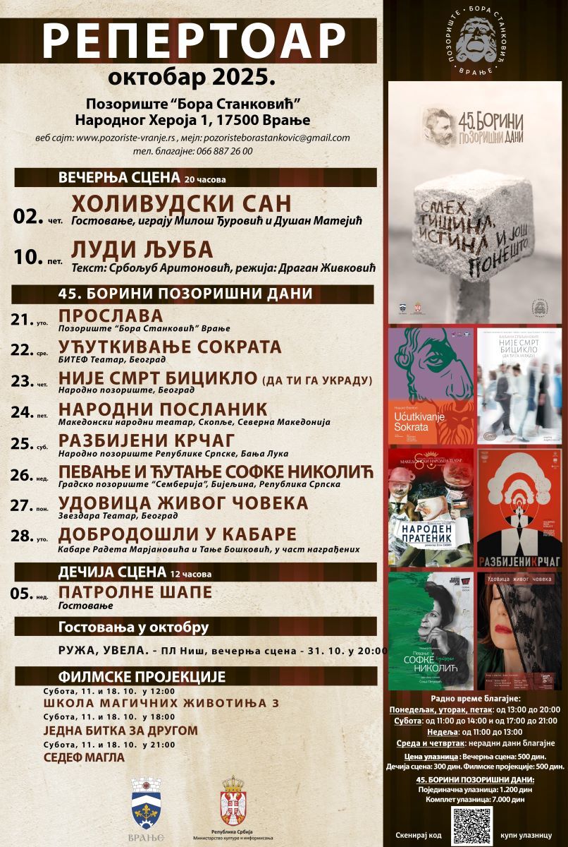 Када је реч о позоришном репертоару, у петак 10. октобра, од 20 часова биће приказана представа ,,Луди Љуба“, по тексту Србољуба Аритоновића и у режији Драгана Живковића.