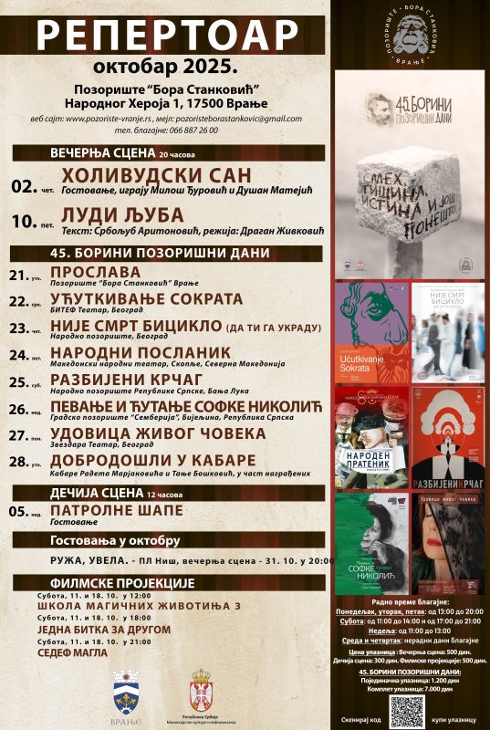 У Позоришту ,,Бора Станковић“ одржана је конференција за медије на којој је селектор 45. ,,Бориних позоришних дана", Мирослав Радоњић, директор Стеријиног позорја, представио програм овогодишњег фестивала, који ће бити одржан под слоганом ,,Смех, тишина, истина и још понешто“. У име градског руководства конференцији је присуствовао заменик градоначелника Милан Илић. ,,Готово пола века постојања довољно говори о значају овог фестивала, не само за наш град, већ и за читав културни живот Србије. Могу слободно да кажем да је фестивал ,,Борини позоришни дани“ један од најпрепознатљивијих и најзначајнијих у нашој земљи и драго ми је да ту традицију негујемо годинама. Град Врање ће наставити да пружа безрезервну подршку позоришту приликом реализације свих будућих активности“, истакао је заменик. На конференцији је говорила и Кристина Јањић Стојановић, директорка Позоришта ,,Бора Станковић“, која се захвалила на подршци свима који су помогли у организацији фестивала. ,,Ове године прослављамо значајни јубилеј, а новина је да ће представа ,,Прослава“, врањског театра, бити у такмичарском програму, којом ћемо отворити фестивал 21. октобра“, истакла је директорка. Селектор Мирослав Радоњић најпре је честитао Позоришту ,,Бора Станковић“ на великом јубилеју, 45. година одржавања фестивала и истакао да овакве манифестације на најбољи начин репрезентују оно што је позоришна уметност у најширем смислу те речи. ,,Упућујем честитке и Граду Врању који годинама пружа подршку фестивалу, јер је то прави начин да истинске вредности једне средине буду одржане. Без тога губимо свој идентитет, традицију, баштину, језик и савремено стваралашаштво. Овогодишњи избор позоришних комада представља врх позоришне продукције у овом региону у протеклим месецима. Трудио сам се да изаберем представе које су естетски и уметнички вредне, али које истовремено кореспондирају са публиком“, истакао је селектор Радоњић.