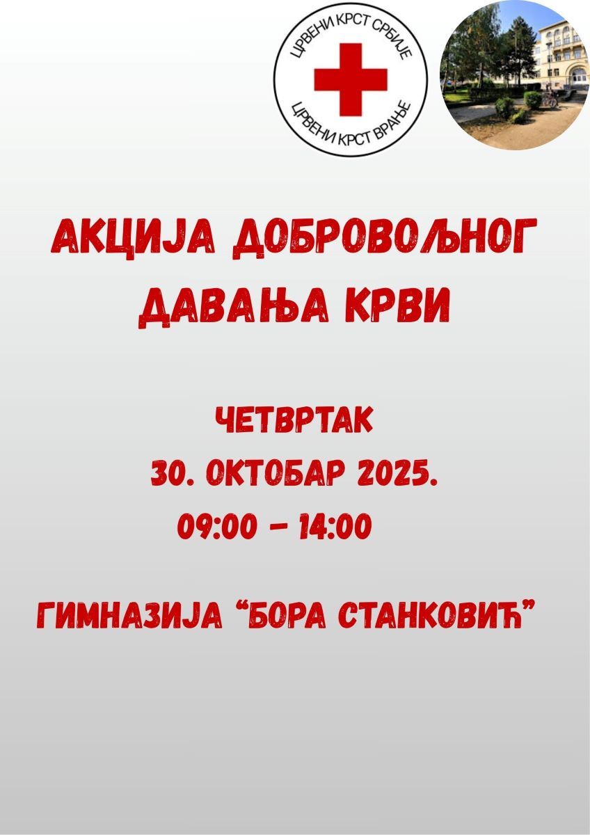 Црвени крст Врање у сарадњи са Гимназијом ,,Бора Станковић“ организује акцију добровољног давања крви, у четвртак 30. октобра од 09.00 до 14.00 часова у просторијама школе Гимназија „Бора Станковић“.