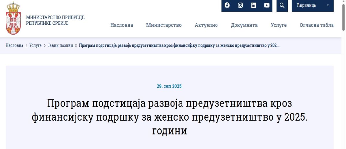 Министарство привреде у сарадњи са Фондом за развој Републике Србије спроводи Програм подстицања развоја предузетништва кроз финансијску подршку за женско предузетништво у 2025. години.