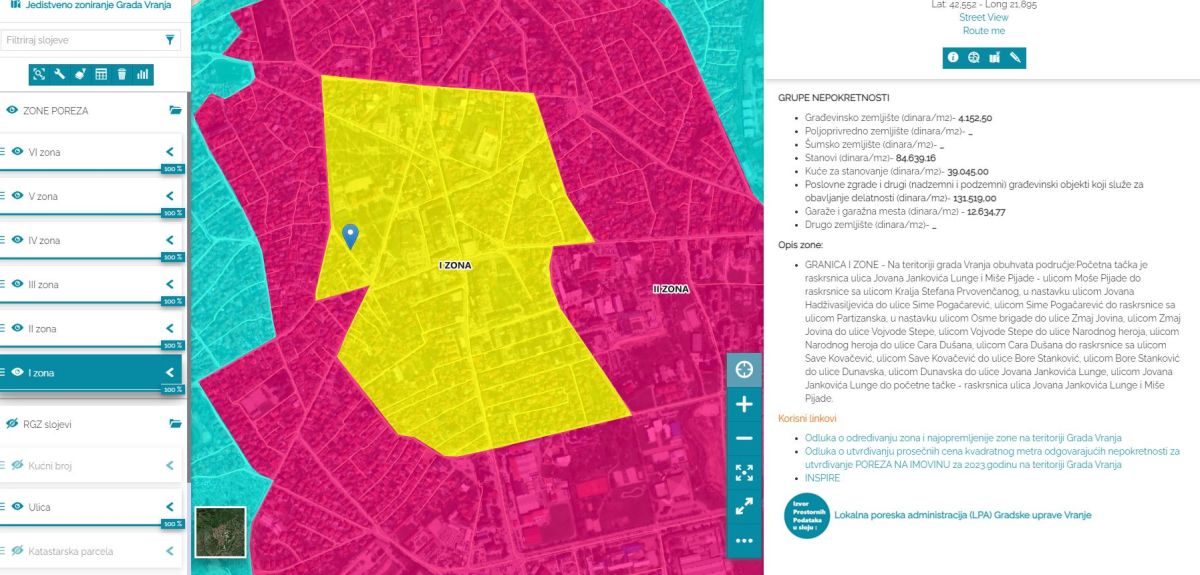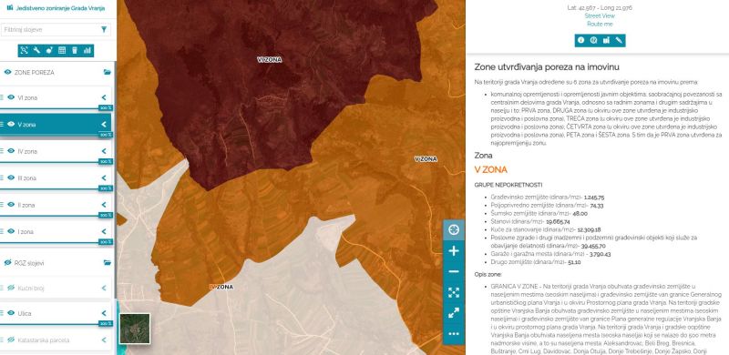 Слојеви пружају увид у зоне за утврђивање пореза на имовину, градске општине Врање и градске општине Врањска Бања, са просечним ценама непокретности по м2 за текућу годину.