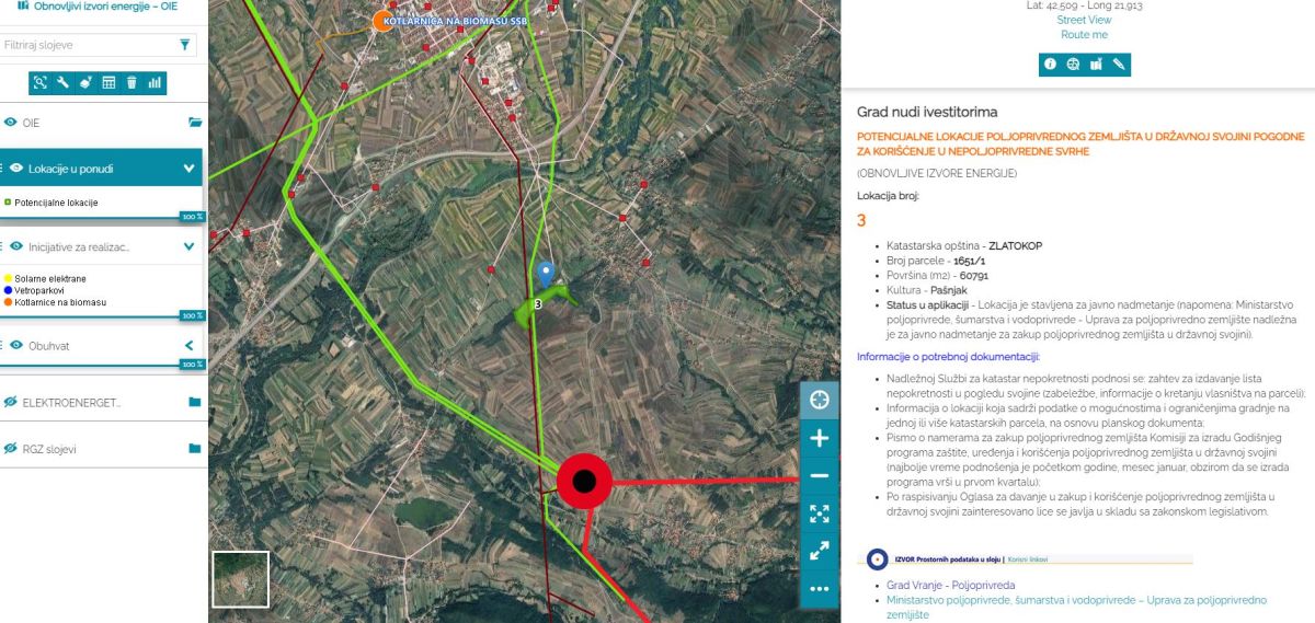 Слој „Потенцијалне локације које Град нуди инвеститорима“ односе се на локације пољопривредног земљишта у државној својини погодне за коришћење у непољопривредне сврхе, односно обновљиве изворе енергије.