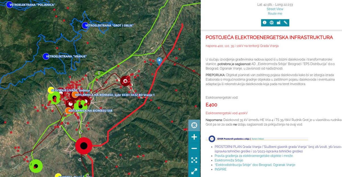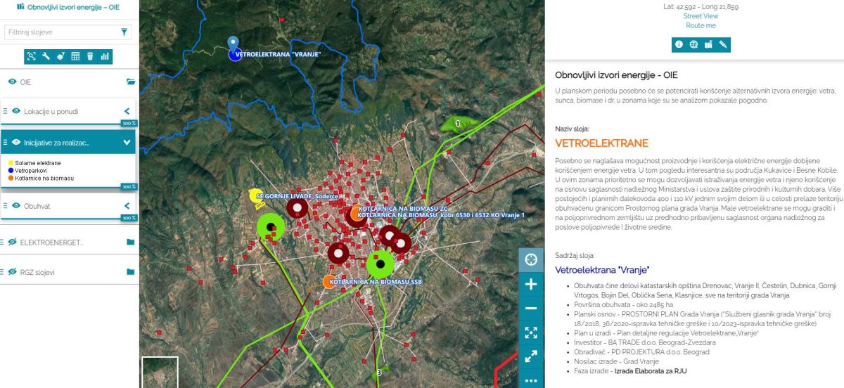 Град Врање препознат је као перспективно подручје за коришћење енергије ветра и сунца, о чему сведоче већ три иницијативе за реализацију пројеката изградње ветроелектрана и још толико за реализацију пројеката изградње соларних електрана. У циљу развоја што већег броја инвестиција, ГИС Врање ГеоПортал пружа визуализацију постојеће електроенергетске инфраструктуре на територији локалне самоуправе, у групи „Електроенергетска инфраструктура“, као неопходан предуслов изградње објеката за производњу електричне енергије из обновљивих извора и предвиђање њиховог прикључењa на преносну мрежу, одговарајућег капацитета.