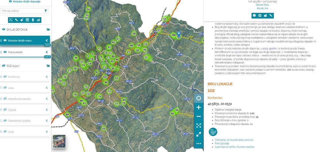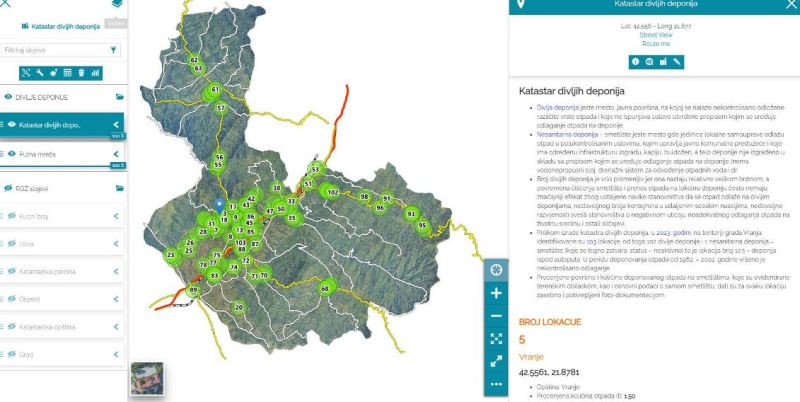 GIS Vranje GeoPortal objavljuje prostorne podatke Katastar divljih deponija. U 2023. godini, na teritoriji grada Vranja, identifikovane su 103 lokacije, od toga 102 divlje deponije i 1 nesanitarna deponija – smetlište. Procenjene površine i količine deponovanog otpada na smetlištima, koje su evidentirane terenskim obilaskom, kao i osnovni podaci o samom smetlištu, dati su za svaku lokaciju zasebno i potkrepljeni foto dokumentacijom.