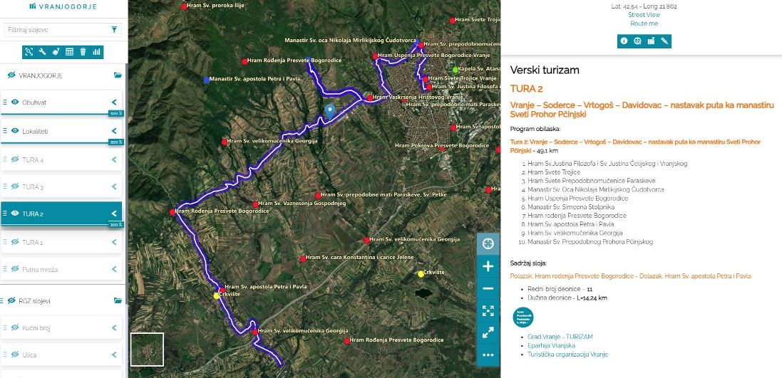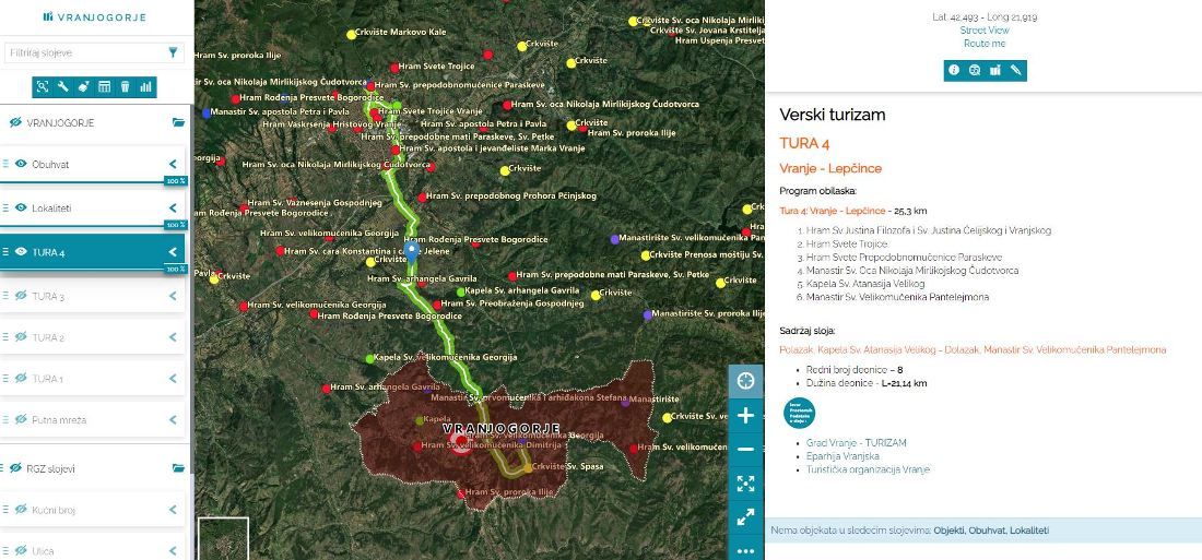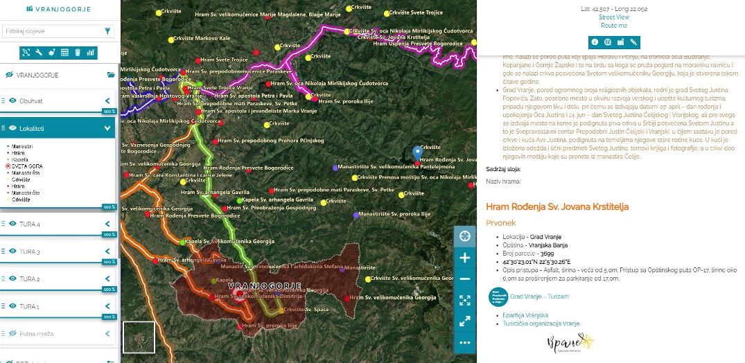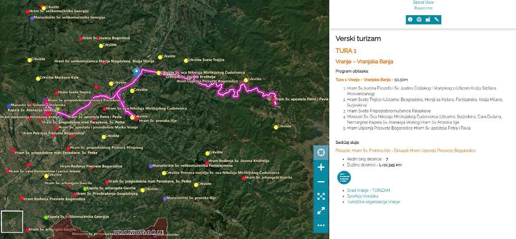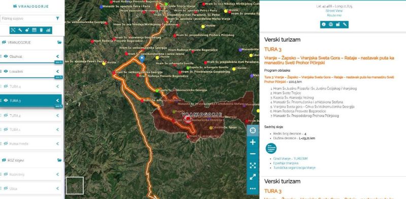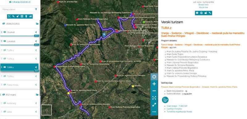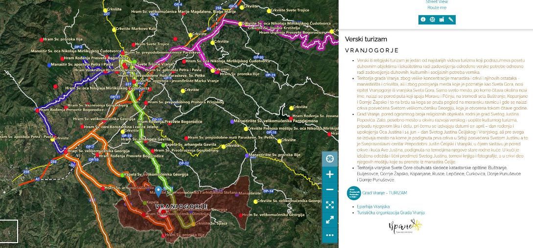 Putem GIS Vranje GeoPortala možete lako pretraživati i pregledavati prostorne podatke o verskom objektima na teritoriji grada. Njihovim mapiranjem ali i povezivanjem, formirane su ture koje predstavljaju osnovu za razvoj verskog turizma Vranja, kao područja sa velikom koncentracijom crkvi, manastira, crkvišta i manastirišta. Tematska karta takođe promoviše mesto koje je posebno naznačeno na karti kao Vranjogorje.