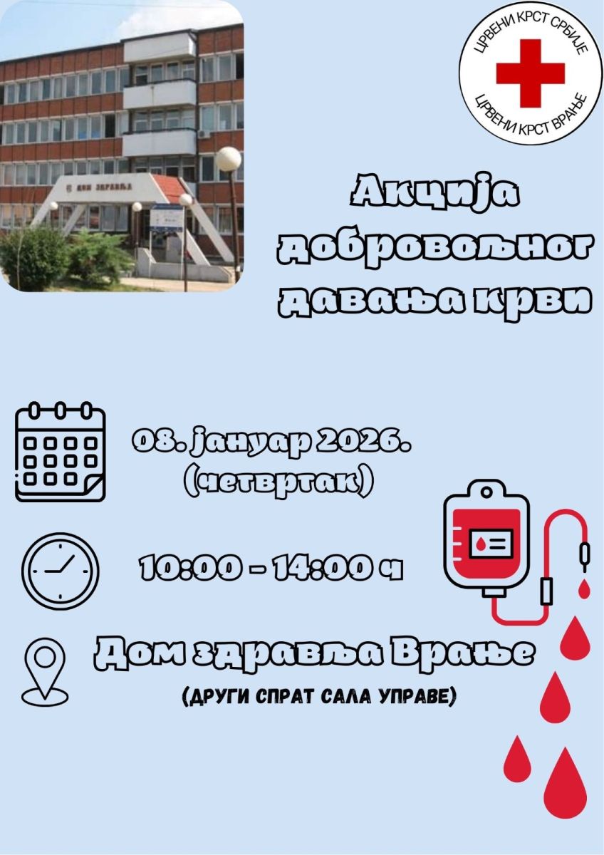 Akcija će biti održana u četvrtak, 08. januara u periodu od 10.00 do 14.00 časova u Domu zdravlja u Vranju, na drugom spratu, u sali Uprave. „Ovim putem pozivamo sve humane ljude da se odazovu pozivu za dobrovoljnim davanjem krvi i tako pokažu svoju humanost na delu. Tvojih pet minuta, nečiji ceo život!“, poručuju iz Crvenog krsta u Vranju.