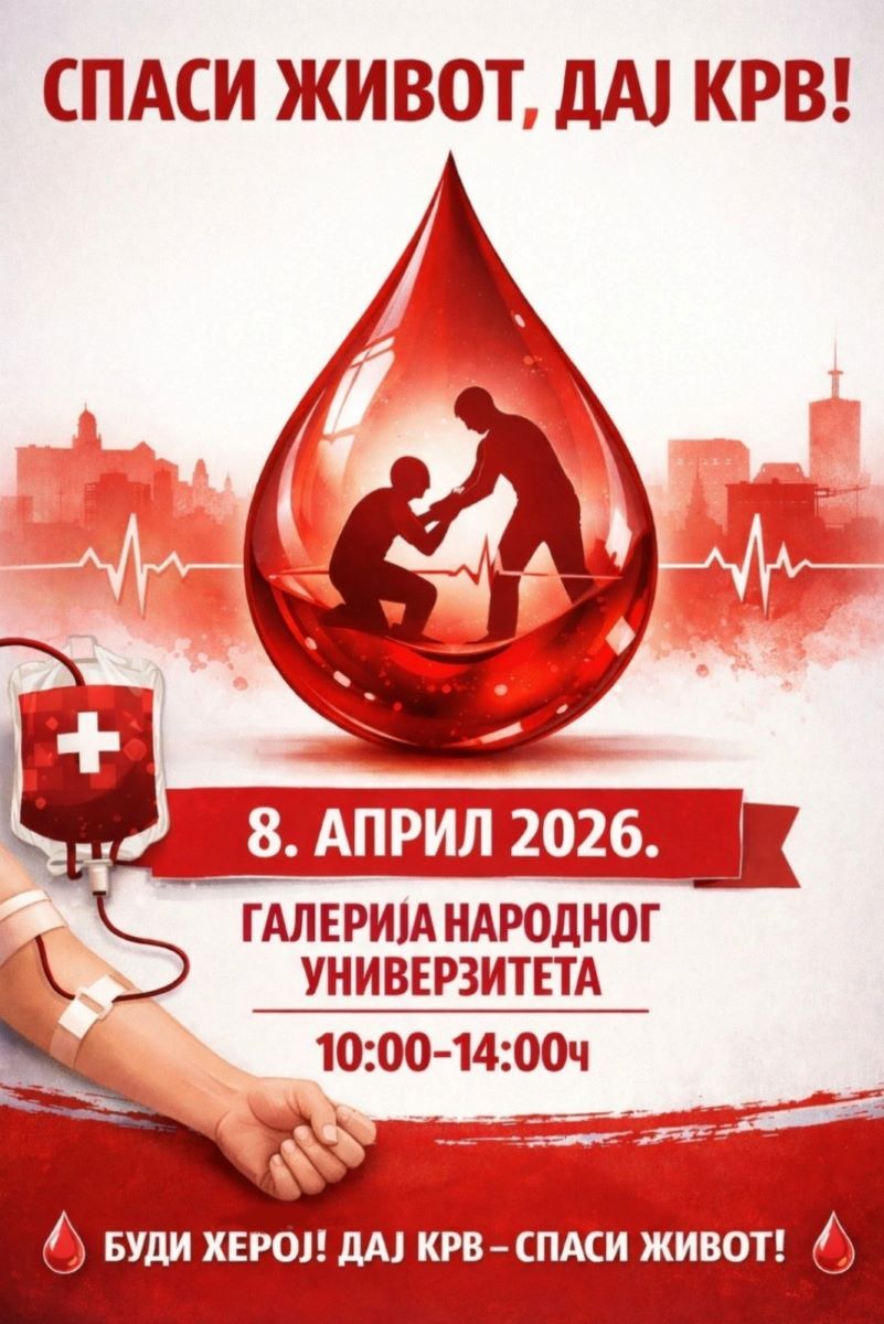 Crveni krst Vranje organizuje novu akciju dobrovoljnog davanja krvi sutra, 8. aprila, od 10 do 14 časova u Galeriji Narodnog univerziteta u Vranju.
