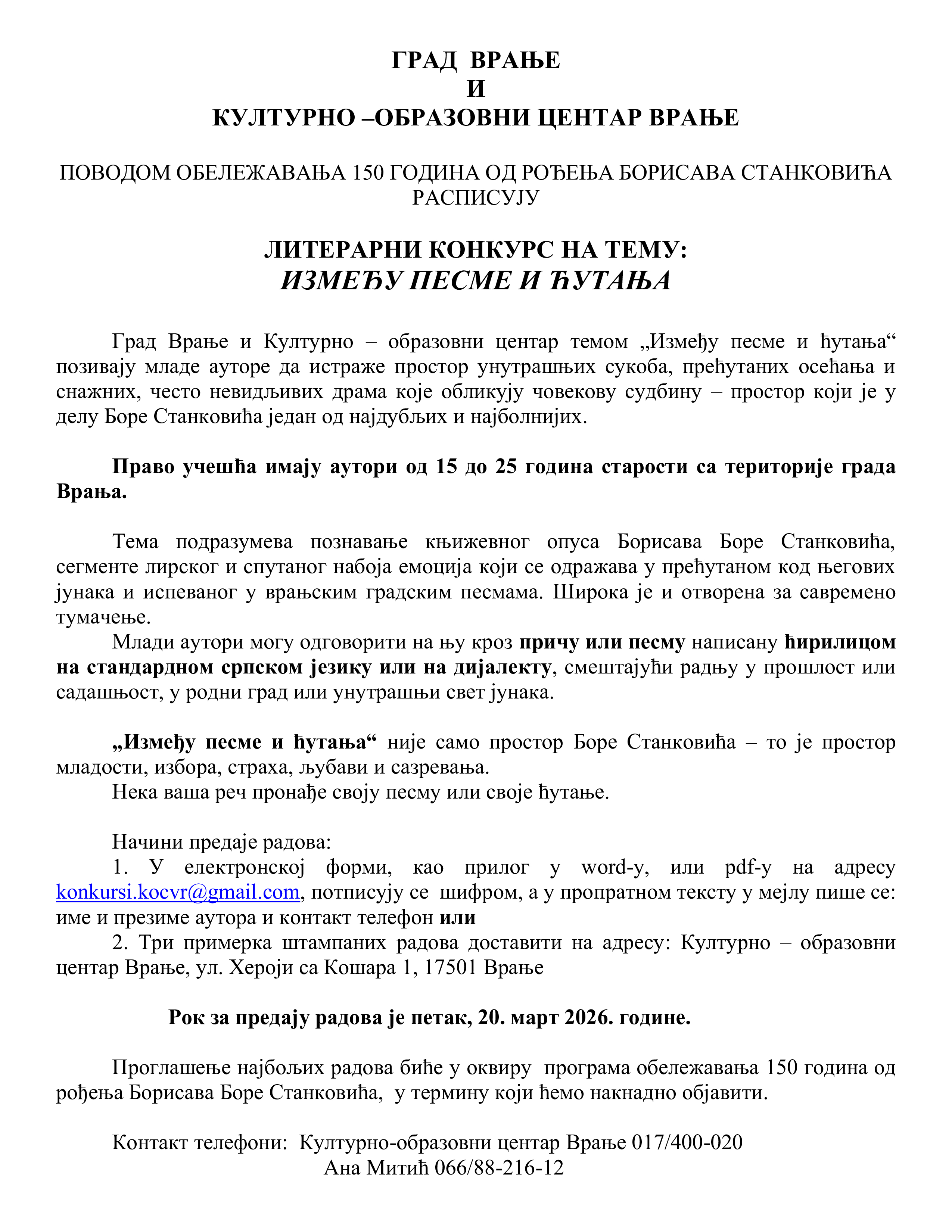 Поводом обележавања 150 година од рођења Борисава Станковића, Град Врање и Културно-образовни центар расписали су литерарни конкурс на тему ,,Између песме и ћутања“. Право учешћа имају аутори старости од 15 до 25 година са територије града Врања. Тема подразумева познавање књижевног опуса Боре Станковића, сегменте лирског и спутаног набоја емоција који се одражава у прећутаном код његових јунака и испеваног у врањским градским песмама. Литерарни радови могу бити у форми приче или песме написани ћирилицом на стандардном српском језику или на дијалекту. Радови се предају у електронској форми на адресу konkursi.kocvr@gmail.com или  на адресу: Културно-образовни центар Врање, ул. Хероји са Кошара бр.1.